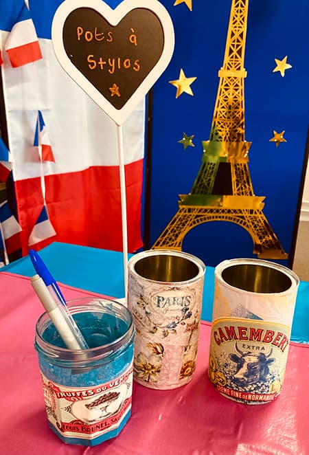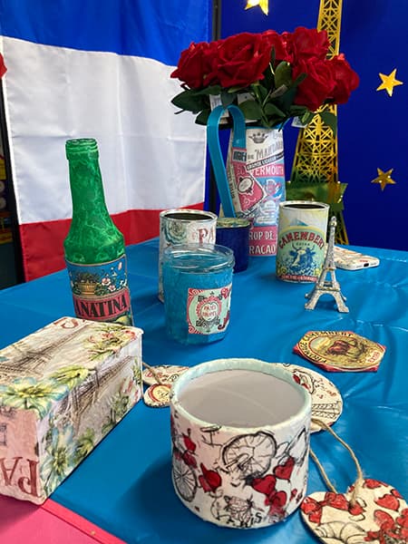 The team’s eye-catching ‘RenouvO’ stand had both an ecological and linguistic dimension: the Year 10 girls created a unique range of French-themed products, upcycled using disused everyday items. Many of these were donated by individuals in school. The technique of découpage was mastered and used to transform the objects.